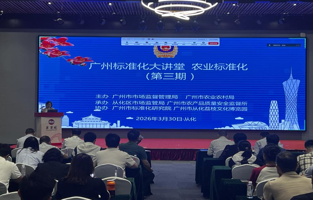 为深入贯彻落实《国家标准化发展纲要》,严格落实省、市“标准领航”工作部署,充分发挥标准在农业高质量发展中的引领、规范、支撑作用,普及标准化知识、传播标准化理念,3月30日,广州市市场监督管理局联合广州市农业农村局主办、广州市标准化院协办,2026年度广州标准化大讲堂(第三期)在从化荔枝博览园顺利举办。本次活动聚焦农业标准化提质增效,助力全市农业产业从“有没有”向“优不优”、从“卖原料”向“卖品牌”转型升级,为广州乡村全面振兴注入标准新动能。